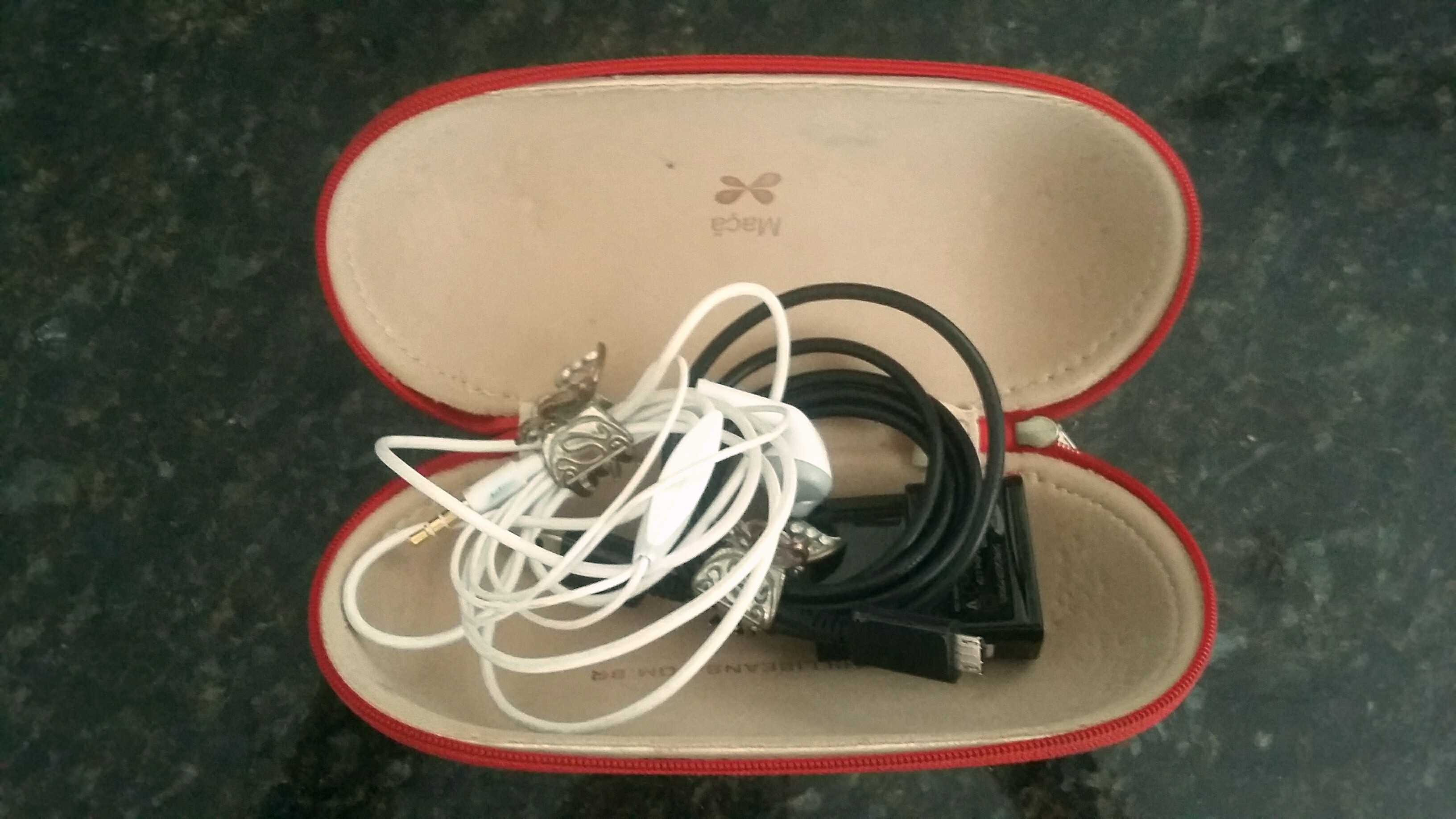 A segunda dica é continuação da primeira. De nada adianta segurar os fios com as piranhas e deixá-los todos soltos perdido dentro da bolsa. Junte tudo que você precisa de carregar de fio atrás de você o dia inteiro e guarde em um só lugar: capinha de óculos. É claro que você também pode usar uma necessaire ou comprar uma bolsinha só para isso, mas a capa de óculo tem o formato ideal e atende muito bem nesse caso. Sem contar que sempre temos um capinha sobrando em casa de um óculos que nem existe mais. E se você não tiver, é muito barato e vale a pena. Pode apostar!