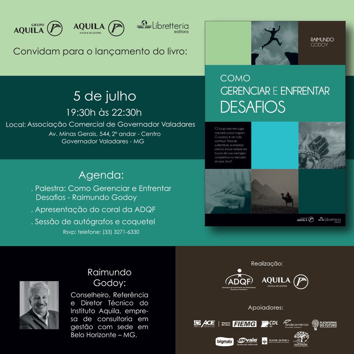 Lançamento de livro + noite de autógrafos! Este é um tipo de evento que eu curto mesmo e faço o possível para marcar presença. Amo ler, conhecer escritores e trocar ideias! Ou seja, fiquei bem empolgada quando o Admilson, da Zoom Comunicação (BH) entrou em contato comigo convidando para o lançamento do livro ‘Como gerenciar e enfrentar desafios’, do Raimundo Godoy. O evento, que foi realizado pelo Instituto Áquila e ADQF, aconteceu na última quarta (5) aqui em Governador Valadares, na Associação Comercial. Detalhes você confere a seguir.